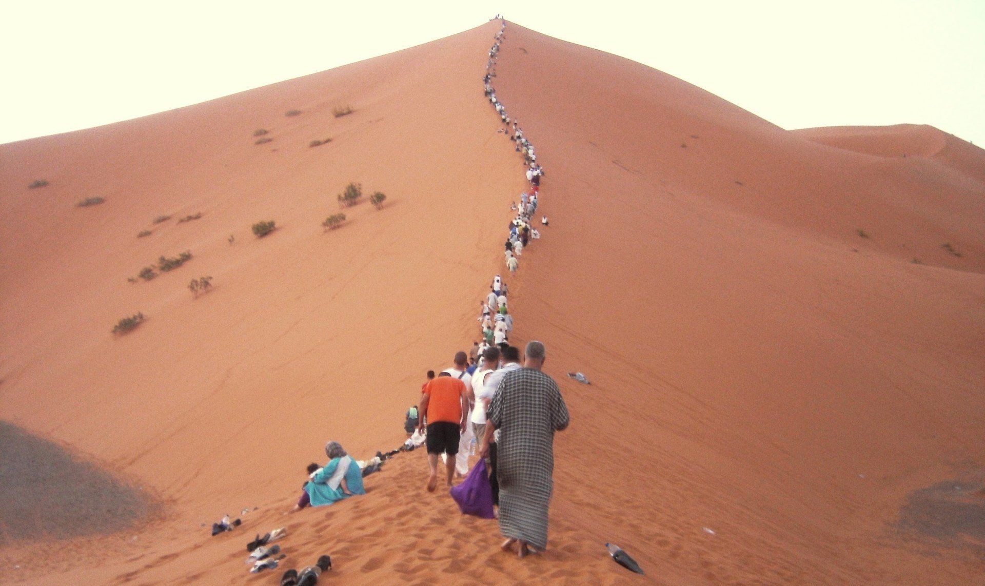 Después del desayuno, vamos en dirección al desierto vía a uno de los espectaculares lugares de Marruecos, las Gargantas de Todra. Es un lugar ideal para caminar y descubrir. Seguiremos hacia Merzouga donde cogeréis los camellos para llegar hasta la haima nomada en medio de las dunas, donde pasaréis la noche. Alojamiento en Campamento del desierto